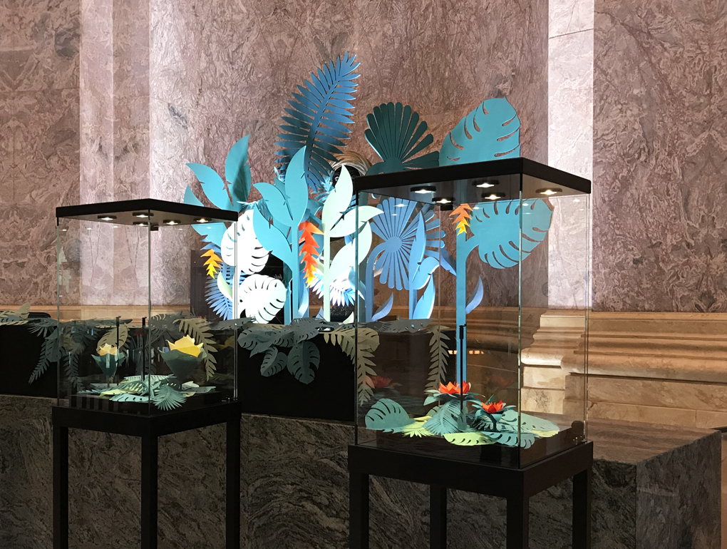 / Décor principal / Végétation tropicale et différentes fleurs exotiques réalisées en papier / Décors disposés à différents emplacements du petit Palais / hauteur maximale 3 mètres